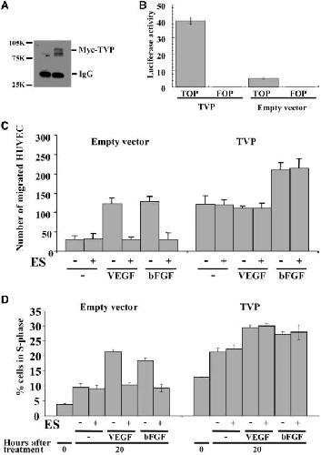 Figure 6. Activated TCF (TVP) reverses the inhibitory effects of ES on endothelial cell migration and cell cycle. For migration assays and cell cycle analysis, TVP-infected HUVECs (TVP-HUVEC) or empty virus-infected HUVECs were used. TVP-HUVECs expressed Myc-TVP as detected by anti-Myc antibodies (A) and had elevated TOP-FLASH reporter activity (B). (C) Migration assays were performed in Boyden chambers with VEGF (20 ng/ml) or bFGF (20 ng/ml) as stimulants. ES (1 μg/ml) had no effect on TVP-HUVECs. (D) FACS® analysis of the cell cycle stage was performed with VEGF (20 ng/ml) or bFGF (20 ng/ml) as stimulants in the presence or absence of ES (20 μg/ml). ES reduced the number of cells entering the S phase in control HUVECs but not in TVP-HUVECs. |