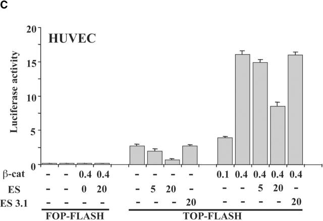 Figure 2. ES inhibits β-cateninâdependent signaling. (A) Embryos were injected into one ventral vegetal blastomere with 50 pg of β-catenin (β-cat) RNA with or without 2 ng of ES or ES-m RNA. Secondary axis induction was assessed after 48 h culture at room temperature. (B) Luciferase activity was measured in embryos microinjected with the Siamois promoterâreporter construct (pSiaLuc). pSia-Luc activation by β-catenin was reduced by ES but not by ES-m. (C) The effect of ES on β-catenin signaling in endothelial cells. Transcriptional activation of the TOP-FLASH and FOP-FLASH reporters was measured in HUVECs transfected with indicated plasmids in the presence or absence ES or ES mutant (ES 3.1). Numbers show the amount of ES in μg/ml and the amount of transfected β-catenin plasmid per well of a 6-well plate. Cells were transfected with 0.8 μg of each reporter plasmid. |