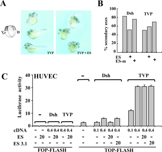 Figure 3. Effects of ES in response to increasing Dsh and TVP activity. (A and B) Embryos were injected into one ventral vegetal blastomere as indicated with the following RNAs: TVP (0.7 pg), Dsh (0.7 ng); ES and ES-m (2 ng). (A) ES failed to inhibit TVP induced secondary axes. (B) The effect of ES constructs on secondary axes induced by Dsh and TVP. Total number of injected embryos varied from 14 to 70 per group. (C) The effect of ES on transcriptional activation of TOP-FLASH in response to Dsh and TVP. HUVECs were transfected with 0.4 μg of TVP or empty vector in the presence (5 or 20 μg/ml) or absence of ES. ES inhibited Dsh-mediated but not TVP-mediated activation of the reporter. |
