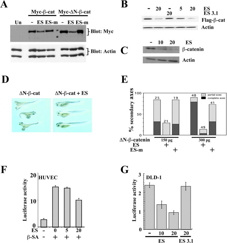 Figure 4. ES down-regulates β-catenin levels. (A) ES decreases steady state β-catenin levels in embryo lysates. Embryos were coinjected with Myc-tagged β-catenin (β-cat) or ÎNâβ-catenin (ÎN-β-cat) RNAs (300 and 100 pg, respectively) and either wild-type or mutated ES RNA. At embryonic stages 8â8.5, β-catenin levels were analyzed by Western blotting with anti-Myc antibodies. ES but not ES-m reduced both β-catenin and ÎNâβ-catenin protein levels. (B) Effect of ES on β-catenin levels in HUVECs. ES (5 or 20 μg/ml) but not mutant ES 3.1 (20 μg/ml) reduced Flagâβ-catenin levels in transfected HUVECs. (C) ES down-regulates endogenous β-catenin in CPAE cells. Cells were incubated with indicated amounts of ES (μg/ml) for 24 h, and cell lysate were collected for western analysis. (D and E) ES blocks the signaling activity of stabilized β-catenin in Xenopus. Embryos were injected with 150â300 pg of ÎNâβ-catenin RNA and 2 ng of ES or ES-m RNA as described in the Fig. 2 legend. (D) Suppression of secondary axes induced by ÎNâβ-catenin. (E) Summary of the data. (F) ES blocks the signaling activity of stabilized β-catenin in HUVECs. Transcriptional activation of TOP-FLASH in HUVECs transfected with 0.4 μg of β-catenin S>A mutant (β-SA) or empty vector in the presence or absence of 5â20 μg/ml of ES. (G) ES down-regulates TOP-FLASH in the colon cancer DLD-1 cells with constitutively high levels of β-catenin signaling. DLD-1 cells were transfected with 0.9 μg of TOP-FLASH reporter plasmid and incubated in the presence (10 or 20 μg/ml) or absence of ES. Cell lysates were collected 24 h after transfection for luciferase activity measurement. |