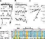 Different conductances of alternative ouabain-resistant PTX-bound pump-channels. (A and B) Currents at –50 mV in outside-out patches excised from oocytes expressing rat α1 (A) or Xenopus DR-α1 (B) Na/K pumps in symmetrical 125 mM Na solutions with 100 μM external ouabain but no pipette ATP, briefly exposed to PTX (50 pM in A and 100 pM in B) until the first channel opening was observed. Lower traces show gating transitions of PTX-bound pump-channels at indicated voltages after washout of unbound toxin; dotted lines mark 0, 1, 2, or 3 open channels. (C) Current amplitudes for channels in A (circles) and B (triangles) plotted against voltage; fits (straight lines) between –100 and –20 mV gave channel conductances γ = 7.5 pS for A and γ = 1.8 pS for B. (D) Sequence alignment of WT Xenopus α1, Xenopus DR-α1, rat α1, and sheep α1 Na,K-ATPases, and rabbit SERCA Ca-ATPase; all residues are numbered from Met 1. Loop 1-2 assignment is from cardiotonic steroid-binding studies (e.g., ref. 14), not later SERCA structures.