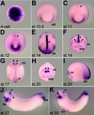 Fig. 2. Expression of Xenopus Isthmin by whole-mount in situ hybridization. Embryos are shown in animal (A), vegetal (BâD), dorsal (E,G), anterior (F,H) or lateral (IâK) view.
