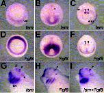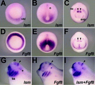 Fig. 3. Comparison of xIsm and xFgf-8 expression. (A,D) Stage 10 embryos in vegetal view; note that xIsm and xFgf-8 expression overlap in the ventrolateral blastopore lip (vbl). (B,E) Stage 17 embryos in dorso-vegetal view showing expression of xIsm and xFgf-8 in the anterior notochord (n). (C,F) Stage 20 embryos in anterior view; note overlapping expression of xIsm and xFgf-8 in cranial neural crest (nc), anterior edge of neural plate (anp), and midbrainâhindbrain border (arrowheads). (GâI) Stage 30 embryos in lateral view. (G) Whole-mount in situ hybridization depicting xIsm expression in the branchial arches (ba), diencephalon (di), ear placode (e), and isthmus (arrowhead). (H) xFgf-8 expression at the same stage. (I) Double in situ hybridization of xIsm and xFgf-8; note the overlap of expression in branchial arches, diencephalon and isthmus (arrowhead), as well as the complementary expression in the ear placode.