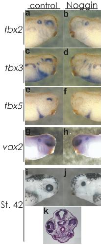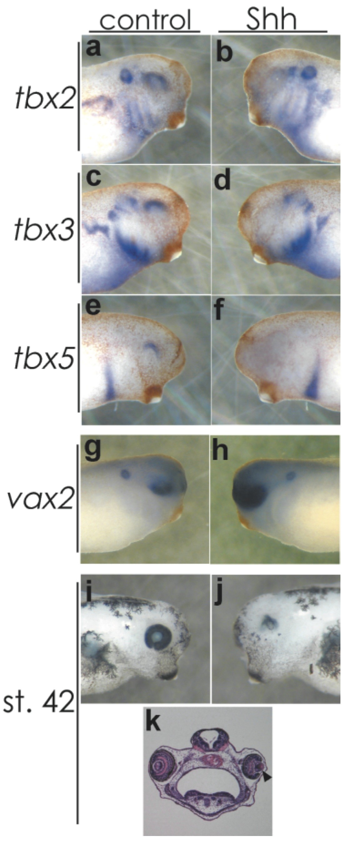 FIG. 3. Overexpression of Shh causes ventral specifications. Dorsal markers tbx2/3/5 disappeared (a). Expanding expres- sion of ventral marker vax2 reached almost the dorsal end of the optic vesicle (g, h). Although the eye became deformed and small by ectopic expression of Shh, a meager lens structure was confirmed in all embryos examined (ik). In situ hybridization was performed at stage 30. Right side in the same embryo: control. . Reproduced with permission of the Publisher, John Wiley & Sons.