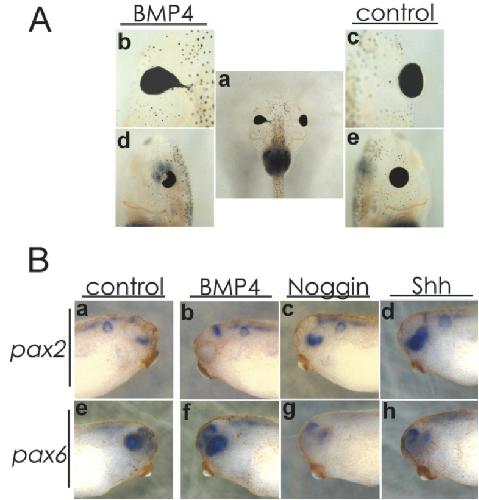 FIG. 4. BMP4 is involved in P-D axis formation of the eye. Overexpression of BMP4 causes abnormal connection between retinal pigment epithelium and brain including loss of the optic stalk at stage 46 (A: a, b, c, dorsal view; A: d, e, lateral view). At the stage 30 embryos, proximal marker pax2 was repressed (B: b) and distal marker pax6 was expanded (B: f) by overexpression of BMP4. Conversely, misexpression of Shh or Noggin promotes the expansion of pax2 (B: c, d) and the suppression of pax6 (B: g, h). In situ hybridization was performed at stage 30.Reproduced with permission of the Publisher, John Wiley & Sons.