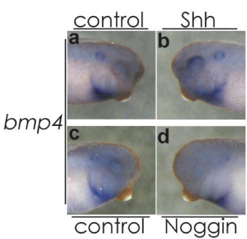 FIG. 5. bmp4 expression in the optic vesicle required both Shh and its own signal. Whereas Shh overexpression rather reinforced the expression of bmp4 (a, b), misexpression of Noggin, an antagonist of BMP, clearly repressed the expression of bmp4 (c, d). In situ hybridization was performed at stage 30. Right side in the same embryo: control. Reproduced with permission of the Publisher, John Wiley & Sons.