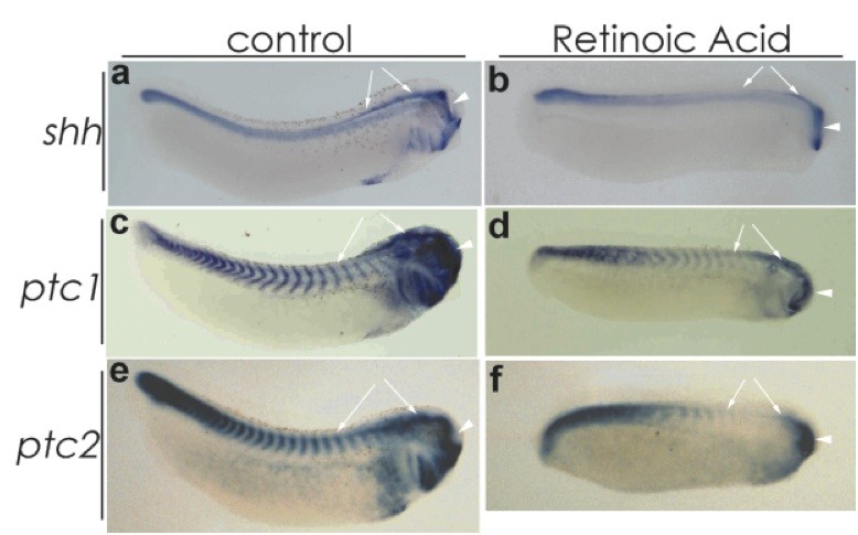 FIG. 7. The repressive effect of RA on shh and Shh-responsive genes, ptc1/2, was relatively weak or almost negligible in the forebrain (a: arrowhead), whereas RA treatment resulted in their strong repression in the caudal brain and anterior neural tube (a: arrow). In situ hybridization was performed at stage 30. Embryos were cleared by benzyl alcohol-benzyl benzoate. Reproduced with permission of the Publisher, John Wiley & Sons.