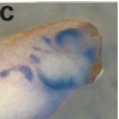 FIG. 2. Misexpression of Noggin represses dorsal fates. Dorsal markers tbx2/3/5 disappeared (a). Ventral marker vax2 expanded over the dorsal side (g, h). At stage 42 embryo, the choroid fissure was observed but no lens was detected (i). In situ hybridization was performed at stage 30. Right side in the same embryo: control. Reproduced with permission of the Publisher, John Wiley & Sons.