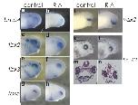 FIG. 6. RA had differential effects on D-V patterning of eye. Stage 16 embryos were treated with 1 M RA and cultured until stage 30 to perform in situ hybridization or stage 42 to verify the malformation of eye. Dorsal marker tbx2/3/5 (c) and bmp4 (a, b) were scarcely suppressed by RA, although the ventral expression borders expanded ventrally (c) and such expression more or less reoriented to the nasal side (ah). On the other hand, ventral marker vax2 was expanded dorsally (i, j). The choroids fissure of RA-treated embryo remained wide open (k, l) while the presence of the meager lens was confirmed (k). Reproduced with permission of the Publisher, John Wiley & Sons.