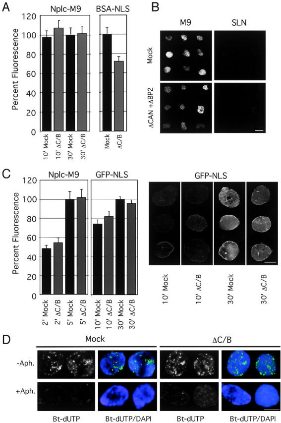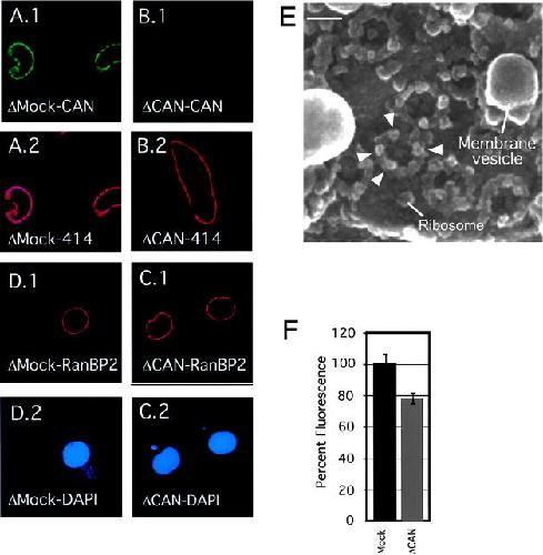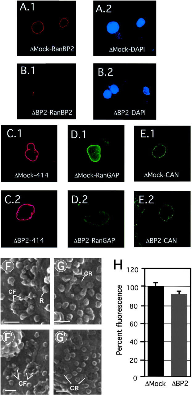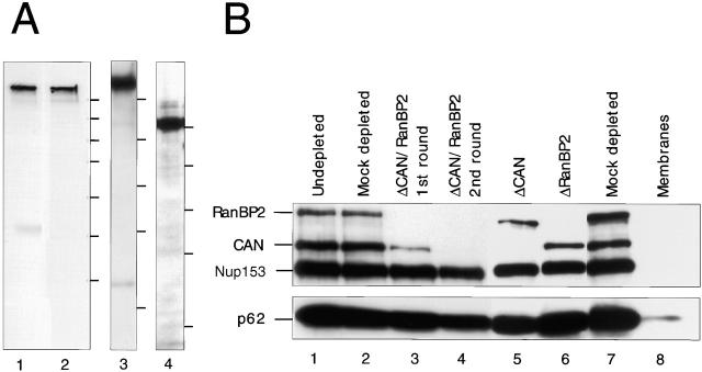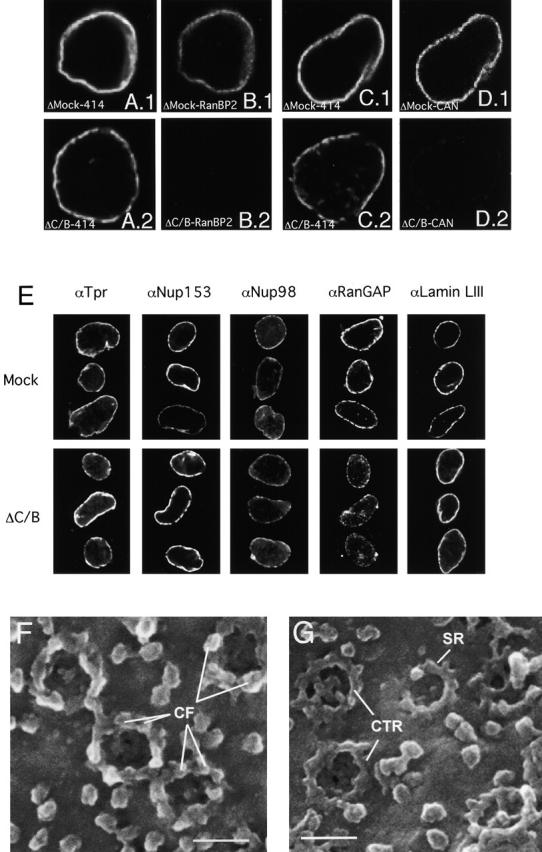 The nuclear pore complex (NPC) mediates bidirectional macromolecular traffic between the nucleus and cytoplasm in eukaryotic cells. Eight filaments project from the NPC into the cytoplasm and are proposed to function in nuclear import. We investigated the localization and function of two nucleoporins on the cytoplasmic face of the NPC, CAN/Nup214 and RanBP2/Nup358. Consistent with previous data, RanBP2 was localized at the cytoplasmic filaments. In contrast, CAN was localized near the cytoplasmic coaxial ring. Unexpectedly, extensive blocking of RanBP2 with gold-conjugated antibodies failed to inhibit nuclear import. Therefore, RanBP2-deficient NPCs were generated by in vitro nuclear assembly in RanBP2-depleted Xenopus egg extracts. NPCs were formed that lacked cytoplasmic filaments, but that retained CAN. These nuclei efficiently imported nuclear localization sequence (NLS) or M9 substrates. NPCs lacking CAN retained RanBP2 and cytoplasmic filaments, and showed a minor NLS import defect. NPCs deficient in both CAN and RanBP2 displayed no cytoplasmic filaments and had a strikingly immature cytoplasmic appearance. However, they showed only a slight reduction in NLS-mediated import, no change in M9-mediated import, and were normal in growth and DNA replication. We conclude that RanBP2 is the major nucleoporin component of the cytoplasmic filaments of the NPC, and that these filaments do not have an essential role in importin alpha/beta- or transportin-dependent import.