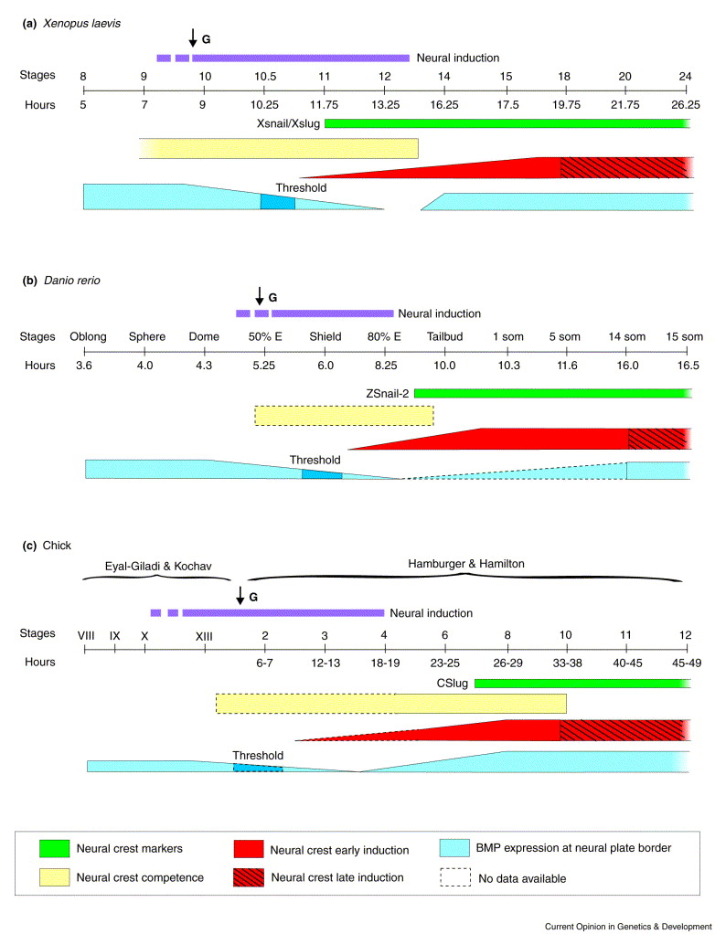 Fig. 1. Temporal analysis of NC induction. Neural induction is compared in three different animal models: (a) Xenopus laevis, (b) Danio rerio (zebrafish) and (c) chick. The expression of early NC markers (green) and the analysis of NC competence (yellow) are used to propose the course of NC induction (red). In Xenopus and zebrafish, this progressive process is highly correlative with a decreased level of BMPs (blue) and with neural induction (purple). For BMPs, the dark blue represents the threshold values required for early NC induction. No early analysis of NC induction has been reported in the chick model. The dashed lines represent processes or expression patterns that have yet to be studied and analyzed. Early NC induction at the open neural tube stage, required for the initial specification of the crest, can be distinguished from late NC induction, which takes place at the neural fold/neural tube stage and is required for the maintenance of the NC cells. ↓G, onset of gastrulation.