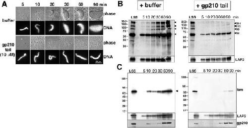 Interference with the cytoplasmic tail of gp210 disrupts "close apposition" of nuclear membranes and blocks nuclear pore dilation.