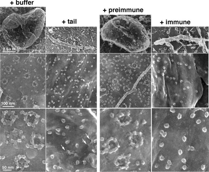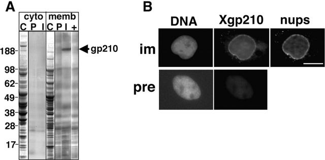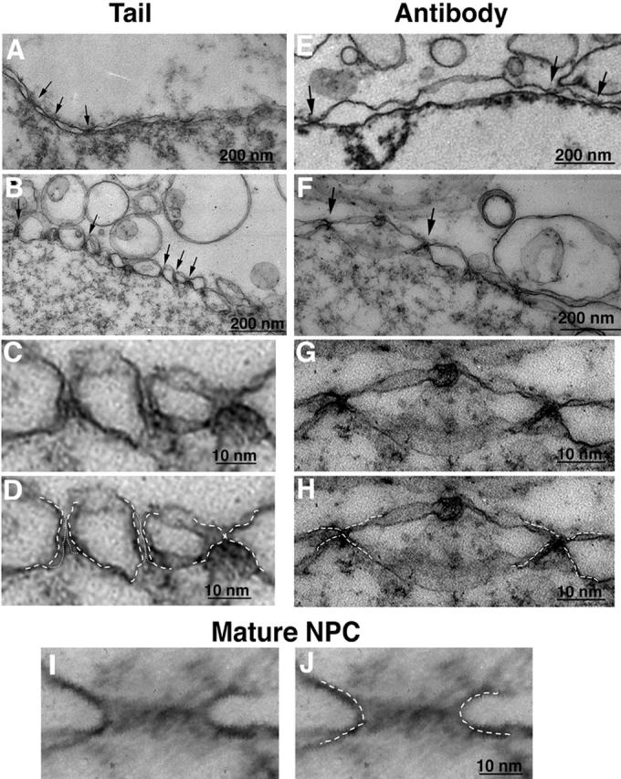 We tested the hypothesis that gp210, an integral membrane protein of nuclear pore complexes (NPCs), mediates nuclear pore formation. Gp210 has a large lumenal domain and small COOH-terminal tail exposed to the cytoplasm. We studied the exposed tail. We added recombinant tail polypeptides to Xenopus nuclear assembly extracts, or inhibited endogenous gp210 tails using anti-tail antibodies. Both strategies had no effect on the formation of fused flattened nuclear membranes, but blocked NPC assembly and nuclear growth. Inhibited nuclei accumulated gp210 and some nucleoporin p62, but failed to incorporate nup214/CAN, nup153, or nup98 and were defective for nuclear import of lamin B3. Scanning and transmission EM revealed a lack of "closely apposed" inner and outer membranes, and the accumulation of novel arrested structures including "mini-pores." We conclude that gp210 has early roles in nuclear pore formation, and that pore dilation is mediated by gp210 and its tail-binding partner(s). We propose that membrane fusion and pore dilation are coupled, acting as a mechanism to control nuclear pore size.