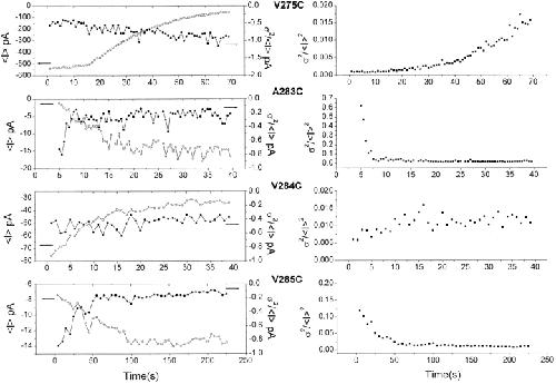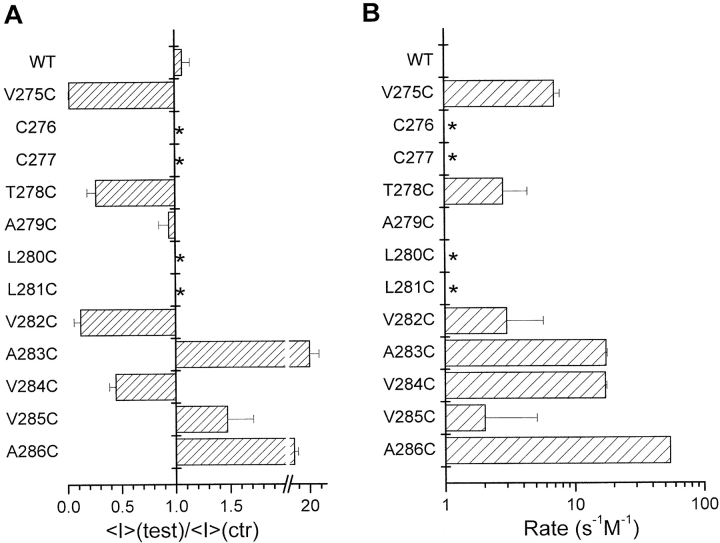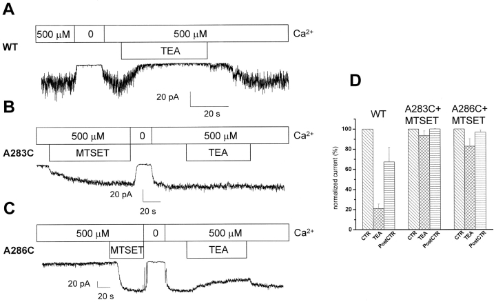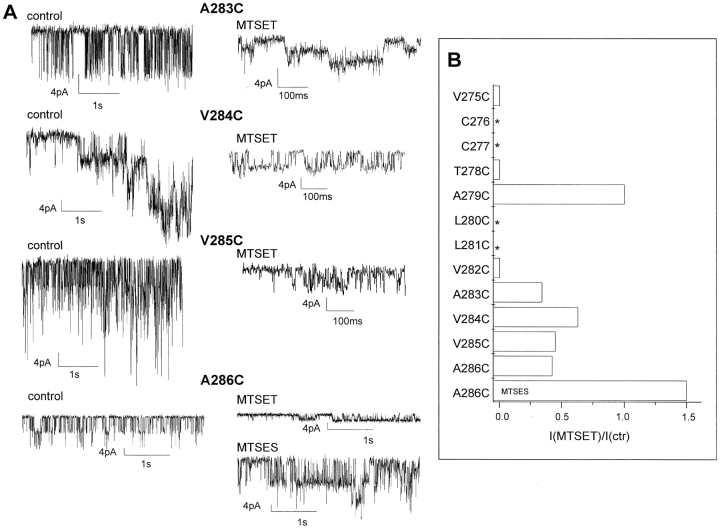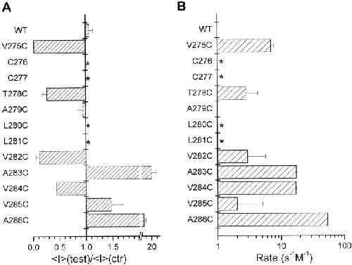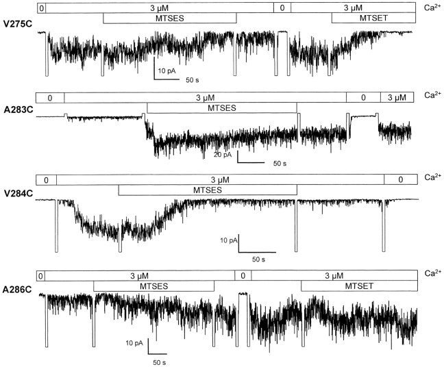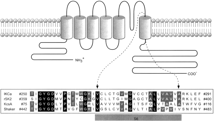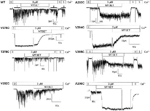 Cysteine-scanning mutagenesis (SCAM) and computer-based modeling were used to investigate key structural features of the S6 transmembrane segment of the calcium-activated K(+) channel of intermediate conductance IKCa. Our SCAM results show that the interaction of [2-(trimethylammonium)ethyl] methanethiosulfonate bromide (MTSET) with cysteines engineered at positions 275, 278, and 282 leads to current inhibition. This effect was state dependent as MTSET appeared less effective at inhibiting IKCa in the closed (zero Ca(2+) conditions) than open state configuration. Our results also indicate that the last four residues in S6, from A283 to A286, are entirely exposed to water in open IKCa channels, whereas MTSET can still reach the 283C and 286C residues with IKCa maintained in a closed state configuration. Notably, the internal application of MTSET or sodium (2-sulfonatoethyl) methanethiosulfonate (MTSES) caused a strong Ca(2+)-dependent stimulation of the A283C, V285C, and A286C currents. However, in contrast to the wild-type IKCa, the MTSET-stimulated A283C and A286C currents appeared to be TEA insensitive, indicating that the MTSET binding at positions 283 and 286 impaired the access of TEA to the channel pore. Three-dimensional structural data were next generated through homology modeling using the KcsA structure as template. In accordance with the SCAM results, the three-dimensional models predict that the V275, T278, and V282 residues should be lining the channel pore. However, the pore dimensions derived for the A283-A286 region cannot account for the MTSET effect on the closed A283C and A286 mutants. Our results suggest that the S6 domain extending from V275 to V282 possesses features corresponding to the inner cavity region of KcsA, and that the COOH terminus end of S6, from A283 to A286, is more flexible than predicted on the basis of the closed KcsA crystallographic structure alone. According to this model, closure by the gate should occur at a point located between the T278 and V282 residues.