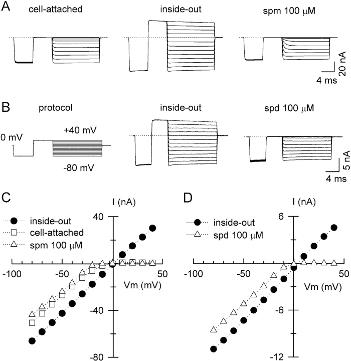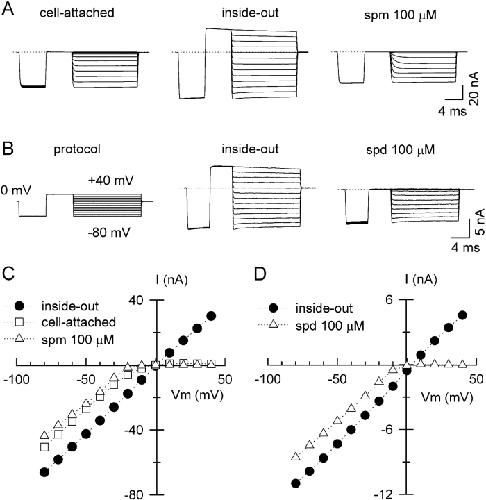 Figure 1. . Inward rectification of Kir2.1 current in cell-attached patch versus inside-out patch. (A) Currents were recorded from Xenopus oocytes injected with Kir2.1 mRNA in the cell-attached patch configuration (left) and following excision as an inside-out patch in the absence (middle) or presence of 100 μM spermine (right). (B) Currents recorded from a different patch in the absence (middle) and presence (right) of 100 μM spermidine. The voltage clamp protocol is shown in the left panel of B. The dotted lines indicate the zero current level. (C) I-V curves of the steady-state current at the end of the test pulses in A. (D) I-V curve of the steady-state current at the end of the test pulse in B. Note the similar shapes of the I-V curve for the cell-attached patch and the excised inside-out patch with 100 μM spermine or spermidine present. |