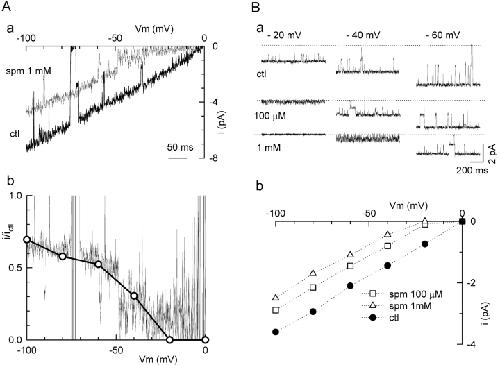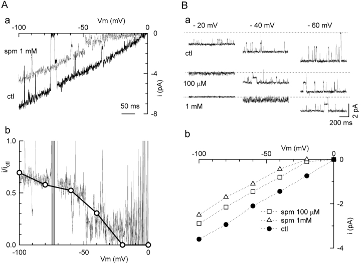 Figure 4. . Two mechanisms of spermine block at different voltages. (A) Single channel recordings during a voltage ramp from −100 to 0 mV, showing the continuous I-V relationship of a single channel in the absence (control) and presence of 1 mM spermine (a). Currents were filtered at 1 kHz and sampled at 2 kHz. The ratio (i/ictl) of the two traces in (a) is shown as the noisy thin line in (b). (B) The single channel recordings at test potentials of −20, −40, and −60 mV in the absence and presence of 100 μM and 1 mM spermine (a). At −60 mV (right), the single channel conductance is reduced by spermine without affecting open channel noise. At −40 mV (middle) in the presence of 100 μM spermine, and at −20 mV (left) in the presence of 1 mM spermine, however, open channel noise is increased. The I-V relations are plotted in (b) and the ratio for 1 mM spermine is plotted in A b (open circles), showing good agreement with the ratio obtained from the voltage ramp. |