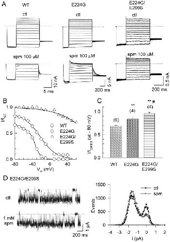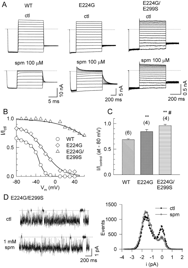 Figure 6. . Effect of neutralizing E224 and E299 on spermine block. (A) Representative macroscopic current recordings from giant inside-out patches excised from oocytes expressing wild-type Kir2.1 (WT), the mutant E224G, and the double mutant E224G/E299S, in the absence and presence of 100 μM spermine. (B) Ratio of the steady-state current in the presence of spermine to that in its absence (Ictl) vs. voltage for WT, E224G, and E224G/E299S. The smooth lines are fitted value to model 2 in Fig. 8 B. (C) Bar graph comparing the reduction in the macroscopic current amplitude at −80 mV by 100 μM spermine, in WT (n = 6), E224G (n = 4), and E224G/E299S (n = 4). **, P < 0.05 compared with WT, and #, P < 0.05 compared with E224G. (D) Single channel recording of the double mutant E224G/E299S in the absence (ctl) and presence of 1 mM spermine. The holding potential was at −80 mV. The left panel shows typical single channel current traces and right panel shows superimposed amplitude histograms. |