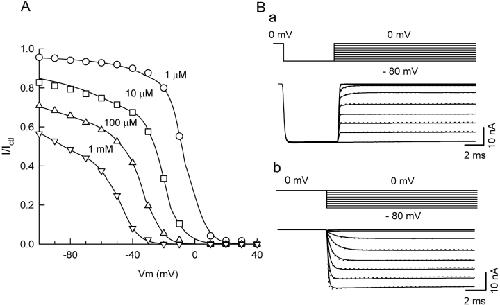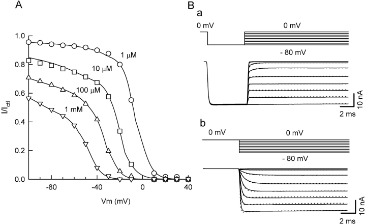 Figure 9. . Fitting model 2 to experimental data. (A) Family of steady-state I-V relationships in the presence of the spermine concentrations indicated. Points are experimental data taken from Fig. 2 C, and lines show the best fit of the model. The parameters determined from the fits are: g01 = 0.48, g02 = 0.28, Kd1 = 5.4 × 10−7 M; Kd2 = 1.48 × 10−5 M, Kd3 = 4.3 × 10−4, Z1 = 0, Z2 = 3.1, Z3 = 4.4. (B) Kinetics of Kir2.1 current block (a) and unblock (b) in the presence of 100 μM spermine using the voltage protocols shown. Points are the experimental data, with best fit of the model shown as superimposed lines. The forward (f) and backward (b) rate constants for the three transitions determined from fit in this patch are: k1f = 2.6 × 1012 M−1s−1, k1b = 1.4 × 106 s−1, k2f = 5.7 × 1012 M−1s−1, k2b = 8.4 × 107 s−1, k3f = 2.4 × 106 M−1s−1 and k3b = 1.2 × 103 s−1. |