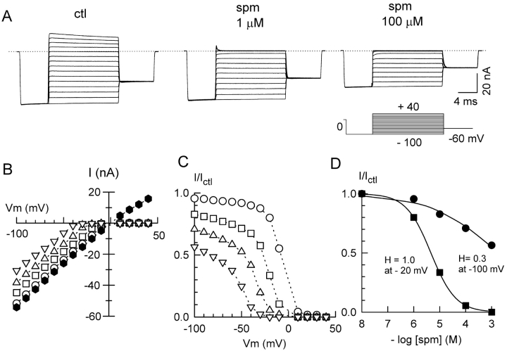 Figure 2. . Macroscopic I-V relationship for different concentration of spermine. (A) Representative current traces recorded from inside-out patch in the presence of 0 (control), 1, and 100 μM spermine. The dotted line indicates the zero current level. Voltage protocol is shown at the bottom. (B) Steady-state I-V curves for control (), and 1 μM (○), 10 μM (□), 100 μM (▵) and 1 mM (▿) spermine. (C) The ratio of the steady-state current (I) in the presence of spermine to that in its absence (Ictl) plotted against voltage, for the spermine concentrations in B (with corresponding symbols). (D) Comparison of the concentration dependence of the spermine block at −100 mV (•) and −20 mV (▪), respectively, from the experimental data in C. Solid lines are best fits to a Hill equation: I/Ictl = 1/(1 + ([spm]/Kd)H), where Kd is spermine concentration causing half-maximal block and H is the Hill coefficient. The values of H at −100 and −20 mV are as indicated. |