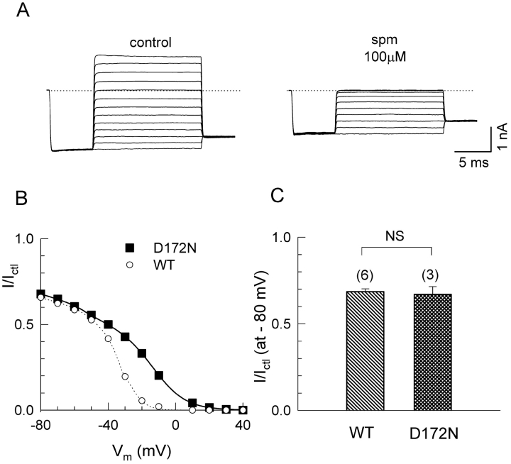 Figure 7. . Effect of neutralizing D172 on spermine block. (A) Representative macroscopic current recordings from oocytes expressing wild-type and D172N channels in the absence and presence of 100 μM spermine. (B) Ratio of the steady-state current in the presence of spermine (I) to that in its absence (Ictl) vs. voltage for WT (the same values as Fig. 6 B) and D172N. The smooth lines are fitted value to model 2 in Fig. 8 B. (C) Bar graph comparing the reduction in the currents at −80 mV by 100 μM spermine, in WT (n = 6), D172N (n = 3). |