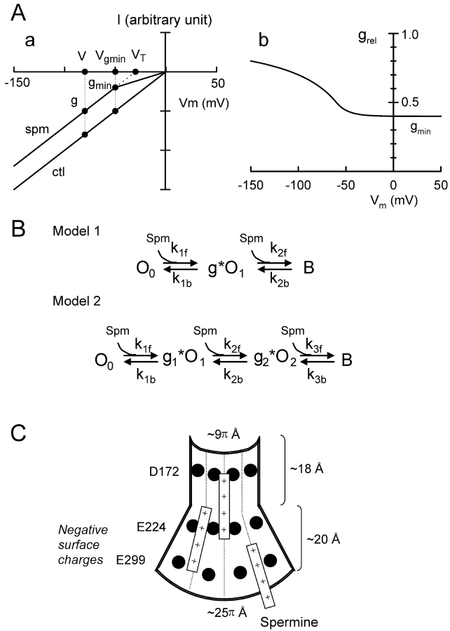 Figure 8. . Proposed model for spermine block of Kir2.1 current. (A) Empirical method to obtain fractional reduction in single channel conductance due to charge-screening by spermine. A a shows superimposed I-V curves in the presence (spm) and absence (ctl) of spermine. A b shows the voltage dependence of the relative conductance (grel) obtained from the ratio of the single channel current amplitude in the presence and absence of spermine in a. See text for details. (B) Reaction schemes for models used to fit the results, with g representing the fractional conductance of open state(s) due to charge-screening by spermine. (C) Schematic representation of the inner vestibule of Kir2.1, cut open from its conical shape to form a sheet. Putative locations of D172, E224, and E299 as indicated, with examples of spermine molecules bound electrostatically at various depths. |
