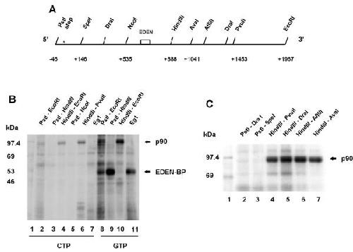 Figure 2. p90 is a sequence specific RNA-binding protein.A Restriction map of c-mos 3'UTR. Numbering is from the stop codon which is indicated by a star (*), EDEN represents the EDEN sequence present in the 3'UTR of c-mos. B and C Mapping of the binding sites of p90 in the c-mos 3'UTR. 32P-CTP (panel B: lanes 2–7) and 32P-GTP (panel B: lanes 8–11 and panel C: lanes 2–7) labeled transcripts, that correspond to different regions of the c-mos 3'UTR, were synthesised and used in UV crosslinking analyses as described in the legend to Figure 1. The portions of the c-mos 3'UTR cDNA used as template to synthesise the different RNAs is indicated above the lanes. The positions of p90 and EDEN-BP are indicated on the right of the panels and the sizes of the molecular weight markers (lane 1) are indicated on the left.