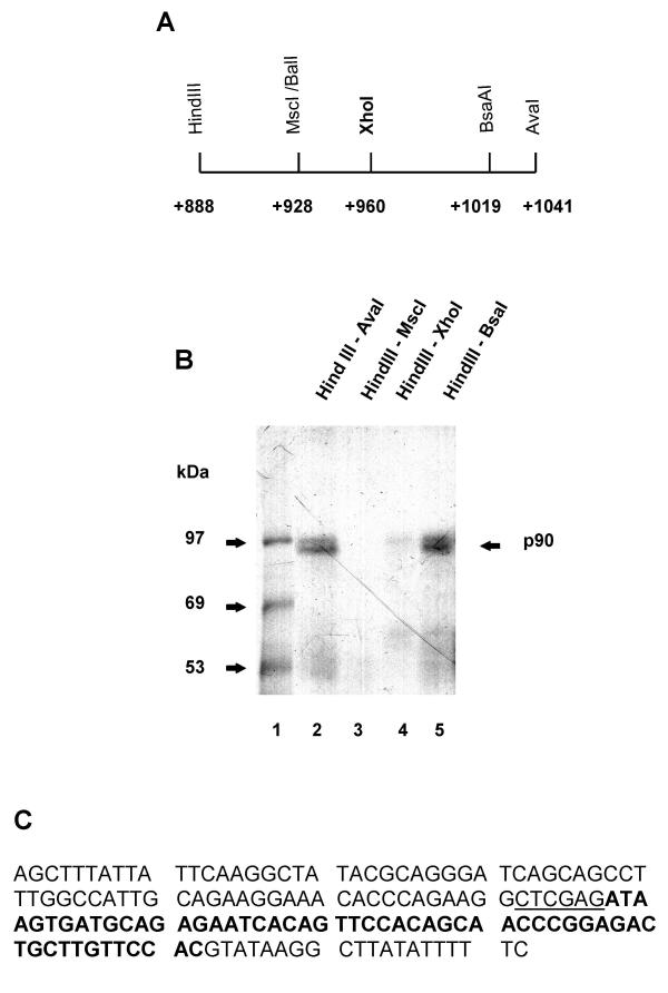 Figure 3. Fine mapping of the p90 binding site.A Restriction map of the HindIII – AvaI region of c-mos 3'UTR cDNA. The position of the XhoI site introduced by mutagenesis is also indicated. Numbering is from the translation stop codon in the complete mRNA. B UV crosslink analysis of 32P-GTP-labeled transcripts that contain sequence information from different portions of the HindIII-AvaI regions of the c-mos 3'UTR cDNA, as indicated above the lanes. The position of the p90 protein is indicated on the right and the sizes of the molecular weight markers (lane 1) are indicated on the left. C The sequence of c-mos 3'UTR contained between the HindIII – AvaI restriction sites in the cDNA. The introduced XhoI site is underlined. The portion required for p90 binding is indicated in bold type.