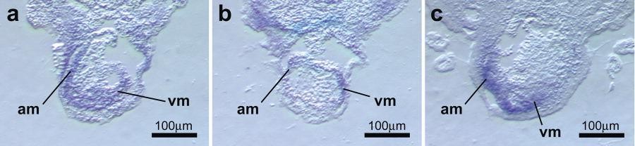 Figure 6. Cardiac expression of Tbx2, Tbx5, and Tbx20. The in situ hybridization patterns of Tbx2, Tbx5, and Tbx20 in the forming cardiac chambers were examined in transverse sections through the tadpole heart after looping. a: Tbx2 expression was seen in the myocardium of both the atrial (am) and ventricular (vm) regions of the looped heart at stage 36. b: Expression of Tbx5 was restricted primarily to the developing ventricular myocardium at stage 38. c: In contrast to Tbx5, high levels of Tbx20 expression were seen in the atrial region but not in the ventricle (stage 40). Original magnification, 00. |