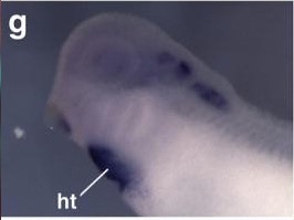 tbx5 (T-box 5) gene expression in Xenopus laevis embryo, assayed via in situ hybridization, NF stage 19, anterior view, dorsal up.