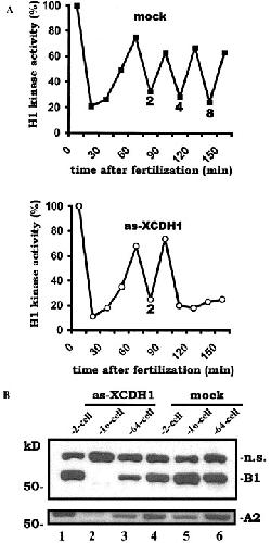 Loss of CDH1 function in early embryonic cell cycles leads to prolonged arrest with low CDK activity. (A) Time course of histone H1 kinase activity immuno-precipitated with an antibody to CDK1. Both blastomeres of the 2-cell stage embryos were mock-injected with PBS (mock; upper panel), or injected with 4 ng as-XCDH1 RNA (lower panel). Five embryos from each group were collected and lysed every 15 min. The lysates were immunoprecipitated with anti-CDC2/CDK1 antibody and the precipitates were assayed for relative histone H1 kinase activity. Cell numbers of the embryos are indicated. Experiments were repeated twice with similar results. (B) Western blot analysis of cyclins. Five embryos were collected at each of the indicated stages. B1: cyclin B1. A2: cyclin A2. n.s.: non-specific band. Experiments were repeated twice with similar results.