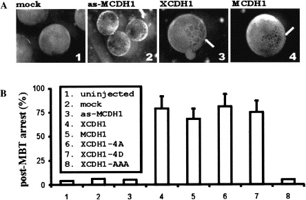 Overexpression of CDH1 induces post-MBT arrest. (A) Representative images of embryos. One blastomere of the 2-cell stage embryos was mock-injected with PBS (mock; panel 1) or injected separately with 4 ng of the indicated RNAs: as-MCDH1 (panel 2), XCDH1 (panel 3), and MCDH1 (panel 4). Images were photographed at stage 8.5–9.5. The arrow indicates the arrested large cells on the injected side. (B) Graphic quantitation. For each indicated group 25–30 embryos were counted. Each bar represents the average values from three experiments.