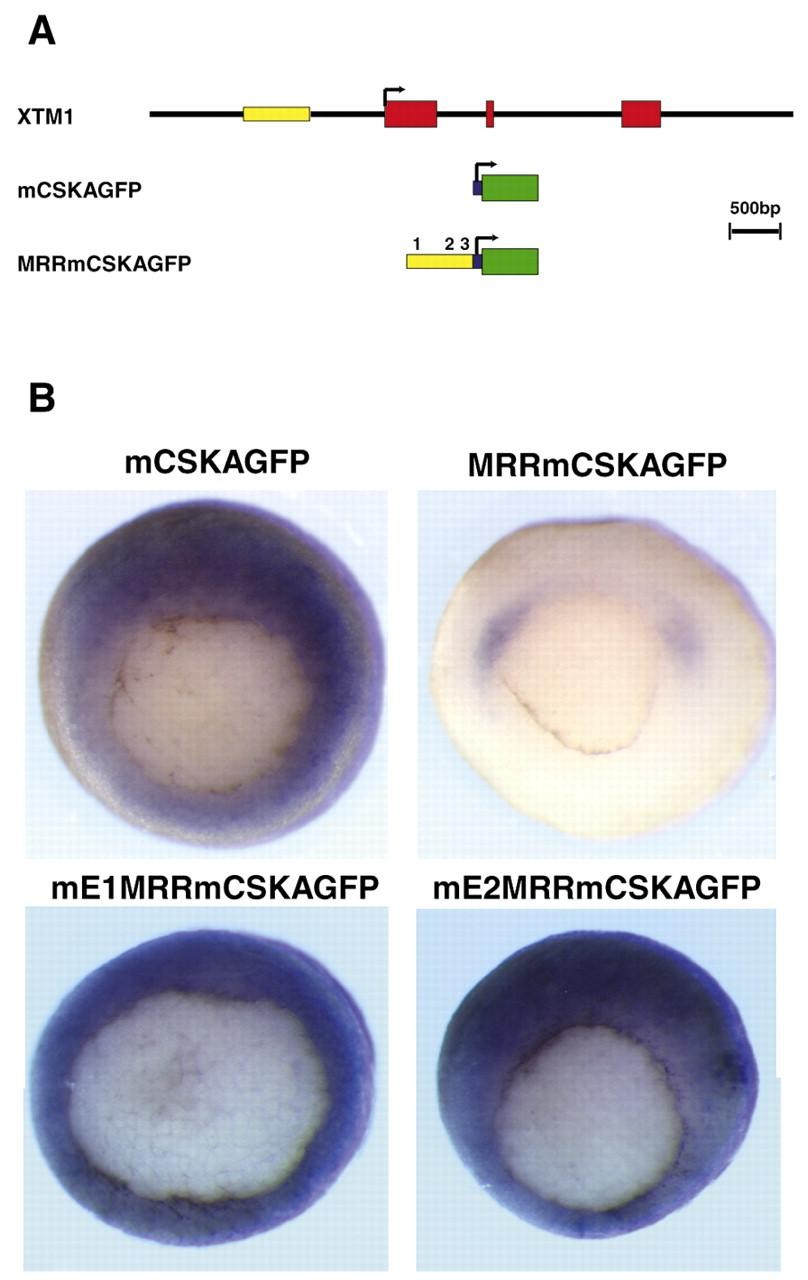 Fig. 3. (A) Schematic representation of the mCSKA minimal promoter constructs. The 785 bp MRR (yellow) was cloned in front of the mCSKA minimal promoter (101 bp shown in blue) driving the expression of GFP (shown in green) to create the transgene MRRmCSKAGFP. The numbers 1, 2 and 3 illustrate the position of the 3 putative HBX sites. (B) Expression of MRRmCSKAGFP and deletion derivatives at the gastrula stage. Expression was analysed by mRNA in situ hybridisation to GFP. All embryos are orientated with dorsal pointing up and the vegetal pole facing out.
