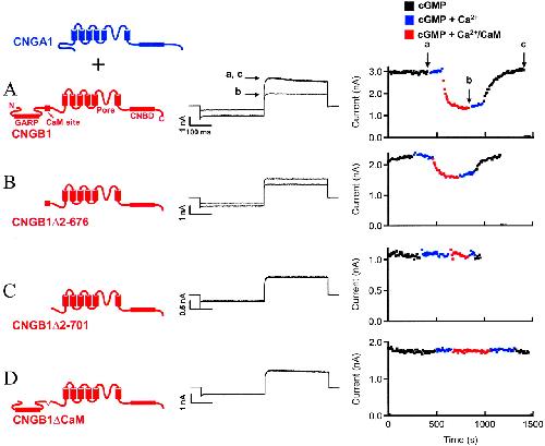 Figure 1 Localization of a region in rod CNG channels necessary for inhibition by Ca2+/CaM. (A) (Left) Cartoon image depicting coexpression of CNGA1 and CNGB1 subunits. (Center) cGMP-activated currents from wild-type CNGA1/CNGB1 channels in the absence (a and c) and presence (b) of Ca2+/CaM. (Right) Time course of current inhibition by Ca2+/CaM. Arrows labeled aâc indicate points that correspond to the current traces (Center). (B) cGMP-activated currents from CNGA1/CNGB1δ2â676 channels and time course of inhibition in the presence of Ca2+/CaM. (C) Lack of effect of Ca2+/CaM on CNGA1/CNGB1δ2â701 channels. (D) Lack of effect of Ca2+/CaM on CNGA1/CNGB1δCaM channels. Several CNG channel domains are labeled in A. GARP, glutamic acid-rich protein.
