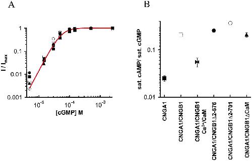 Figure 2 Functional properties of CNG channels. (A) cGMP doseâresponse relationships from a representative patch for CNGA1 (â ), CNGA1/CNGB1 (â¡), CNGA1/CNGB1δ2â676 (â), CNGA1/CNGB1δ2â701 (â), and CNGA1/CNGB1δCaM (â´). Currents were measured at 60 mV, normalized to the maximum value in saturating cGMP (2.5 mM), and superimposed with the Hill equation, I/Imax = 1/(1+ (K1/2/[cGMP])n), with K1/2 = 55 μM and n = 2.5. (B) Fractional activation of CNG channels by cAMP, a partial agonist. Each channel construct is depicted by the same symbol as in A, except for Ca2+/CaM with CNGA1/CNGB1 (bowties). Values were determined by normalizing the current at 60 mV in saturating (16 mM) cAMP (or saturating cAMP with Ca2+/CaM) to that in saturating (2.5 mM) cGMP. Error bars represent the SEM; those not visible are within the symbols. n is ⥠3 for each point.