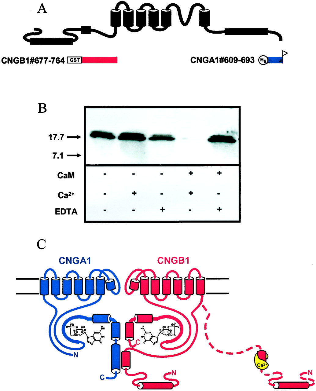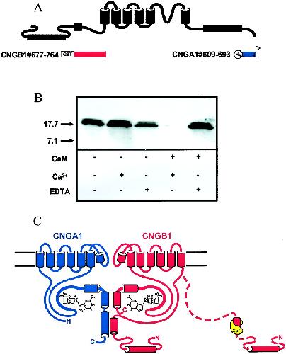 Figure 5 Disruption of the interaction between CNGA1 and CNGB1 by Ca2+/CaM. (A) Bait proteins derived from CNGB1 (red) and fish protein derived from CNGA1 (blue). (B) Western blot of pull-down experiments with the bait protein CNGB1#677â764 and the fish protein CNGA1#609â693, in the presence of EDTA, Ca2+, or CaM. (C) An intersubunit interaction between the distal C-terminal domain of CNGA1 and an N-terminal domain of CNGB1 and prevention of the interaction by Ca2+/CaM.