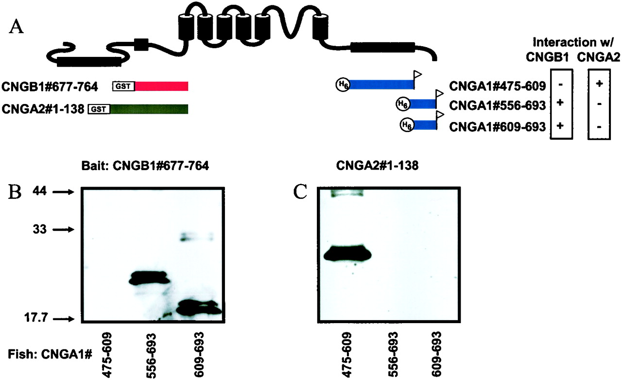 Figure 3 Difference in molecular determinants for interdomain interactions in CNGA1/CNGB1 channels versus CNGA2 channels. (A) Cartoon showing bait proteins derived from CNGA2 (gray) and CNGB1 (red) and fish proteins derived from CNGA1 (blue) located directly beneath the corresponding region of a generic CNG subunit. The exact amino acid composition of the fusion proteins are given by the numbers within each associated name. (B) Western blot of biochemical pull-down interaction using CNGB1#677â764 as bait and CNGA2#1â138 as fish. (C) Western blot using CNGA2-derived protein as bait and the same fish proteins as in B.