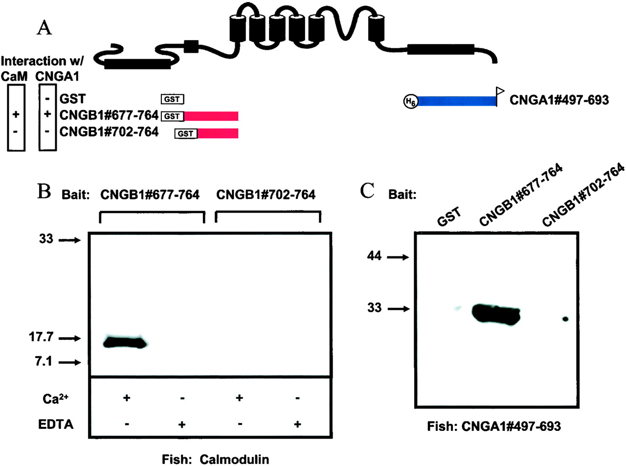 Figure 4 Requirement of N-terminal Ca2+/CaM binding site in CNGB1 for binding both Ca2+/CaM and a C-terminal domain of CNGA1. (A) Cartoon showing bait and fish fusion proteins and their position relative to a generic CNG channel subunit. (B) Gel showing results of biochemical pull-down interaction assay between bait proteins CNGB1#677â764 and CNGB1#702â764 and fluorescently labeled CaM in the presence of Ca2+ or EDTA. (C) Western blot showing results of pull-down assays with bait proteins CNGB1#677â764 and CNGB1#702â764 and the fish protein CNGA1#497â693.