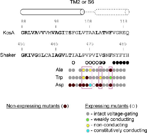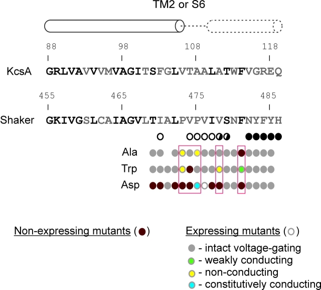 Figure 7. . Summary of phenotypes observed for mutations in the intracellular part of the S6 segment. Sequence alignment between TM2 of KcsA K+ channel and S6 of the Shaker Kv channel with highly conserved residues shown in black. As in Fig. 1, the circles below Shaker sequence diagram results of gated accessibility studies with thiosulfonates (Liu et al., 1997). Functionally expressing mutant phenotypes are indicated with gray circles containing different color filling and nonexpressing mutants are shown with solid maroon circles. |