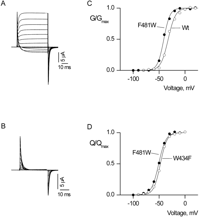 Figure 4. . Ionic and gating currents for a weakly conducting mutant Shaker Kv channel. (A) Family of ionic current records. Holding voltage was −100 mV, tail voltage was −100 mV, and depolarizations were from −100 to 50 mV, in 10-mV increments. A P/−4 protocol was used to subtract leak and linear capacitive currents. (B) Family of gating currents recorded in the presence of 1 μM Agitoxin-2. Membrane voltage was depolarized for 30 ms to various test voltages (−100 to 10 mV) and then repolarized to the holding voltage (−100 mV). A P/−4 protocol was used to subtract leak and linear capacitive currents. (C) G-V relations for Wt and F481W. Conductance was calculated from the amplitude of steady-state current before repolarization, normalized and plotted versus voltage. Smooth curves are single Boltzmann fits to the data with parameters as follows: Wt: V50 = −32.8 mV, z = 3.7; F481W: V50 = −41.3 mV, z = 4.4. (D) Normalized Q-V relations for W434F and F481W. Q was obtained by integrating both the ON and OFF components of gating current, taking their average and normalizing to Qmax measured at depolarized voltages. Smooth curves are single Boltzmann fits to the data with parameters as follows: W434F: V50 = −47.2 mV, z = 4.1; F481W: V50 = −50.2 mV, z = 3.6. |