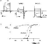 Figure 5. . Constitutive conduction in the P475D mutant of the Shaker Kv channel. (A) Families of ionic currents for Wt, P475W, and P475D. For Wt, holding voltage was −90 mV, tail voltage was −70 mV, and depolarizations were from −70 to 90 mV, in 10-mV increments. For P475W, holding voltage was −100 mV, tail voltage was −100 mV, and depolarizations were from −100 to 50 mV, in 10-mV increments. For P475D, the holding voltage was −110 mV and membrane voltage was stepped to −150 mV for 200 ms before recording the traces shown. Tail voltage was −150 mV, and depolarizations were from −150 to 20 mV, in 10-mV increments. In the case of P475D, the extracellular solution contained 50 mM K+ instead of Rb+. Linear capacity and background conductances were identified and subtracted by blocking the Shaker channel with Agitoxin-2. Dashed line indicates the position of zero current. (B) G-V relations for Wt, P475W, and P475D. Normalized tail current amplitudes are plotted versus the voltage of the preceding depolarization. Smooth curves are single Boltzmann fits to the data with parameters as follows: Wt: V50 = −31.0 mV, z = 4.2; P475W: V50 = −50.9 mV, z = 3.2; P475D: V50 = −103.2 mV, z = 3.0. |
