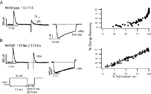 Figure 2. . Relationship between gating charge recovery and channel closure in the wild-type and the W434F channel. The percentage of gating charge recovery was determined using the double pulse protocol by calculating the ratio of the ON gating charge in the second pulse to that in the first pulse (left). Tail currents from the left panels are shown on the middle panels on a different time scale. Solutions used in the experiments were (A) symmetrical 1 K+ + 115 Tris+ for wild-type and (B) symmetrical 115 Na+ for W434F channels. (A) In the wild-type channel the relationship between charge recovery and channel closing is nonlinear in 1 K+ solutions, (B) but it is linear in the W434F mutant in 115 Na+ solutions. In the wild-type, 13% of the charge recovered (A, left) while the tail current dropped 48% compared with its peak value (A, middle) in this patch; however, (B) in W434F a tail current loss of 54% was accompanied by 58% charge recovery. These results from many patches (WT: n = 29; W434F: n = 18) and various interpulse durations are summarized in the point plots (right). |