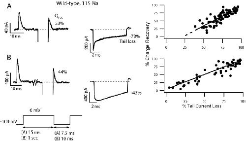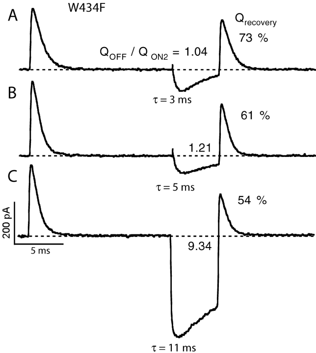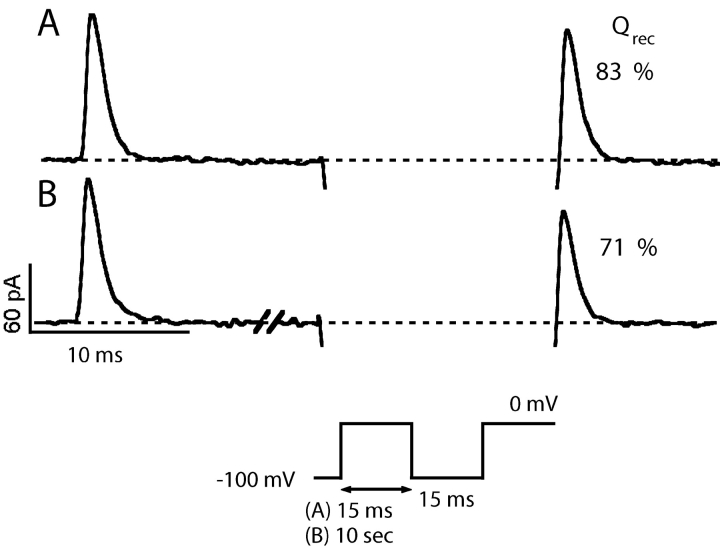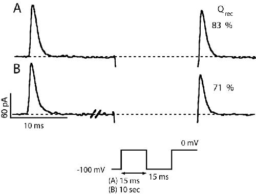 Figure 13. . W434F channels are slow to enter the C-inactivated state. Traces were recorded in symmetrical 115 Na+ solutions from an inside-out patch containing W434F channels. The standard double pulse protocol was used with (A) a 15-ms and (B) a 10-s first pulse duration. Despite the dramatic increase in the duration of the first pulse, little slowing in charge recovery is seen (15 ms first pulse: 83%, 10 s first pulse: 71%). The interpulse duration was 15 ms. The large Na+ tail currents were omitted from the figure for clarity. |