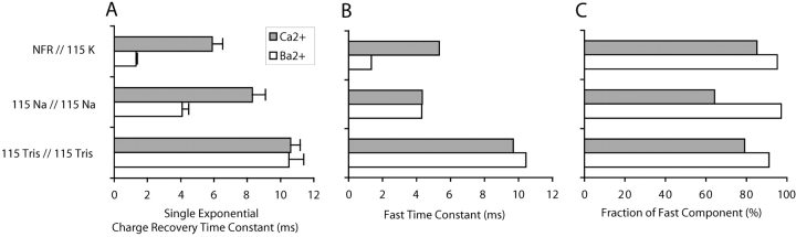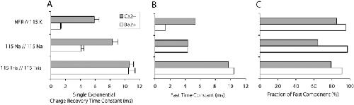 Figure 8. . The effect of external barium on charge recovery rates in the W434F mutant. (A) The overall charge recovery rates are comparisons based on single exponential fits in external solutions containing 1.8 mM Ca2+ (dark bars) and external solutions containing 2 mM Ba2+ (light bars). Labels indicate the composition of the external//internal solutions. Overall, barium had a stronger effect on the rate of charge return in 115 Na+ + 2.5 K+O//115 K+I solutions than in symmetrical 115 Na+ solutions, and had no effect in symmetrical 115 Tris+ solutions. Bars indicate the mean ± SEM of single exponential time constants determined for individual patches. (B and C) Fast time constants of charge recovery and their relative weights obtained from double exponential fits to scatter plots, as described in the legend to Fig. 7. Barium decreased the weight of the slow component in every condition, most notably in Na+O//Na+I. Barium accelerated the fast component when K+ was present, but did not affect it in Na+ and Tris+ solutions. |