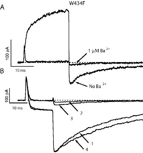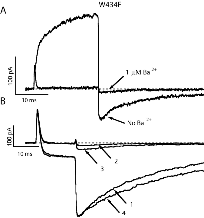 Figure 9. . High affinity block of W434F channels by barium in Na+ and Tris+ solutions. (A) Micromolar concentration of barium blocks W434F channels in K+-free solutions. Depolarizing steps of 20 ms duration to 60 mV were applied every second from a holding potential of −100 mV. Currents were recorded from an outside-out patch containing W434F channels. The external solution contained (in mM) 36 Na+ + 79 Tris+, and the internal solution was 115 Na+, yielding a reversal potential of about −30 mV. Switching to an external solution containing 1 μM Ba2+ resulted in an almost complete block of both the outward current and the inward tail current in five pulses. (B) Inward dissociation of Ba2+ is slow in a Tris+ internal solution. Recordings are from an outside-out patch containing W434F channels. The pipette solution (internal solution) contained 115 Tris+. The external solution originally was 115 Na+. A step pulse to 0 mV for 15 ms followed by a return to −100 mV evoked a small inward Na+ current followed by a large Na+ tail current (trace 1). The external solution was then switched to 115 Tris+ + 2 Ba2+, which abolished all ionic currents, leaving only the gating currents (trace 2). After switching back to 115 Na+ again, the first trace recorded 8 s after the switch showed very little tail current (trace 3), indicating that most of the channels were still blocked by Ba2+. Further washing resulted in the full recovery of the Na+ current (trace 4) with a time constant of 38 s. |
