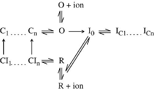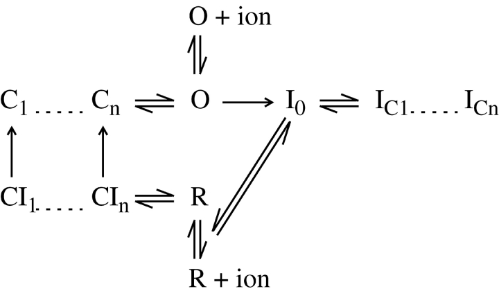 Figure 14. . A model to account for the effects of cations on the gating charge recovery in wild-type and W434F channels. In accordance with current models of activation, the channel has to traverse a series of closed states before opening. The transition into I0 is modulated by cations from the external lock-in site, being the fastest in Na+ and Tris+. A fraction of the channels move on to C-inactivated states that are associated with the shift of the Q-V function. Reaching deeper C-states results in progressively slower charge recovery. Upon repolarization, wild-type channels close quickly from the O state, but the ones recovering from I0 close more slowly into closed-inactivated states through R → CIn due to the slower intrinsic rate of this transition. In the mutant channel, the closing rate of the gate is the same in both branches, and is similar to the closing rate of the wild-type in the lower branch. Closing of the gate in both the top and bottom branches is prevented by ions occupying the cavity, which is represented by the O+ion and R+ion states. Inward ion permeation or internal Tris+ causes a higher population of the O+ion and R+ion states and thus hinders channel closing. The slow recovery from the C-inactivated states generates the slow component of charge recovery. The fast I0 → R transition along with the higher Na+ conductance of the R state is responsible for the rising phase of Na+ tail currents in both channel types. |