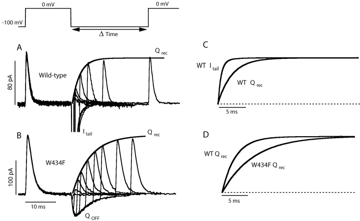 Figure 1. . Rate of gating charge recovery in wild-type and W434F mutant channels. The rate of charge recovery was assessed by using a double pulse protocol. A pair of pulses to 0 mV was applied to inside-out patches separated by varying durations at −100 mV. Both the external and internal solutions contained 1 mM K+ + 115 mM Tris+ to achieve a reversal potential of 0 mV. (A) The depolarizing pulse to 0 mV evokes an ON gating current, then large inward tail currents are seen through the wild-type channels during the repolarizing pulse, and the ON gating current in the second pulse recovers with increasing interpulse durations. (B) Only the OFF gating current is present in the nonconducting mutant during repolarization. (C) Direct comparison of the rate of tail current decay and that of charge recovery in the wild-type channel indicates that channel closing is fast compared with charge return. The actual normalized tail current trace and the fit to the recovering second ON gating currents from A are shown. (D) Charge recovery is significantly faster in the wild-type channels (tau = 2.5 ms for this patch) than in the W434F mutant (tau = 5.9 ms for this patch). The fits were taken from A and B and are shown normalized for direct comparison. |