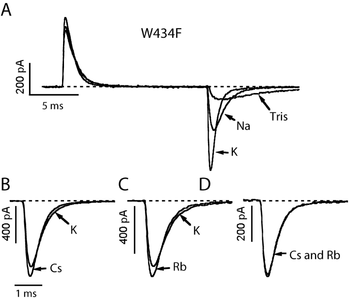 Figure 11. . The effect of internal cations on OFF gating current kinetics. Inside-out patches containing W434F channels were exposed to internal solutions containing 115 mM Tris+, Na+, K+, Rb+, or Cs+, whereas the external solution was NFR + 5 mM Ba2+. Under these conditions, the occupancy of the deep site by Ba2+ is high and barium's interaction with the ion in the cavity will determine the rate of channel closing and OFF gating current decay. Channels were opened by a 15-ms pulse to 0 mV then the voltage was returned to the holding potential of −100 mV eliciting the OFF gating currents. Each part of the figure shows results from a different patch. (A) OFF gating current decay was the slowest with Tris+ as the internal cation (τ = 5.62 ms in this patch), was faster in Na+ (τ = 1.25 ms), and still faster in K+ (τ = 615 μs). (B–D) Differences in OFF gating kinetics were small or negligible when the internal solution was switched between any two of K+, Cs+, or Rb+. B, switch between Cs+ (τ = 394 μs) and K+ (465 μs); C, between Rb+ (477 μs) and K+ (564 μs); and D, between Cs+ (434 μs) and Rb+ (407 μs). |