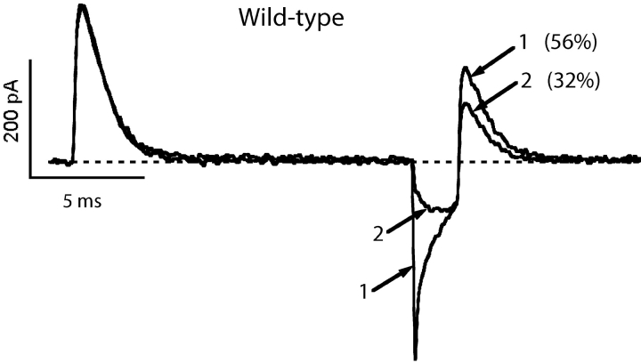 Figure 12. . Block of K+ conduction in the wild-type channel by external Ba2+ slows the rate of charge recovery. The traces were recorded from an inside-out patch in symmetrical 1 K+ + 115 Tris+ solutions with the addition of 2 mM Ba2+ in the pipette. From a holding potential of −100 mV a pair of pulses to 0 mV was applied, separated by 2 ms at −100 mV. Trace 1, recorded first, shows some fast inward K+ tail current and a greater amount of charge recovered in the second pulse (56%). As barium in the pipette solution diffuses into the channels, it blocks the potassium tail current, leaving only the OFF gating current (trace 2). Along with the disappearance of the tail current, a clear slowing of the charge recovery rate is visible in the second ON gating current (32%). |
