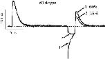 Figure 15. . The three components of Na+ tail currents in the wild-type channel. The trace was recorded in 115 Na+O//115 Na+I solutions from an inside out patch containing wild-type channels. The tail current was elicited by stepping back to −100 mV after a 15-ms long depolarizing pulse to 0 mV. The original data trace is shown with the three exponential components of the fit. The short dashed line indicates the fast component (τ = 236 μs, channels closing from the open state), the long dashed indicates the intermediate component (τ = 4.3 ms, channels returning from I0), and the solid line indicates the slow component (τ = 25.5 ms, channels returning from IC1). |