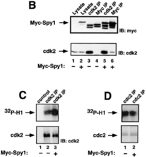 Figure 4. Human Spy1 binds to and activates cdk2. (A) Indirect immunofluorescence on COS-1 cells transiently transfected with human myc-tagged Spy1 (myc–Spy1; bottom left) or with empty vector (mock; top left) shows myc–Spy1 in the nucleus. The corresponding panels on the right are stained with Hoechst dye to illuminate the nuclei of all the cells present. (B) Coimmunoprecipitation of transiently transfected myc–Spy1 with endogenous cdk2 from 293T cells. Western blot analysis using antibodies against the myc epitope tag (top) or against cdk2 (bottom). Lane 1 is lysate from mock-transfected cells. Lane 2 is lysate from myc–Spy1-transfected cells. Lanes 3 and 4 are immunoprecipitations (IPs) from mock-transfected cells, and lanes 5 and 6 are immunoprecipitations from myc–Spy1-transfected cells using either anti-cdk2 (lanes 3 and 5) or anti-myc (lanes 4 and 6). (C) Top panel shows histone H1 phosphorylation assay. 293T cells were transiently transfected with empty vector (mock) or myc–Spy1. 24 h after transfection, cells were harvested and immunoprecipitated with antibodies against cdk2. Lane 1 is histone H1 alone (no IP). Lanes 2 (mock) and 3 (myc–Spy1) are cdk2 IPs. Bottom panel shows blot of cdk2 in IPs from mock and myc–Spy1 cells. (D) Top panel shows histone H1 phosphorylation assay. 293T cells were transiently transfected with empty vector (mock) (lane 1) or myc–Spy1 (lane 2). 24 h after transfection, cells were harvested and immunoprecipitated with antibodies against cdc2. Coomassie blue staining showing equal loading of cdc2 is presented in the bottom panel.